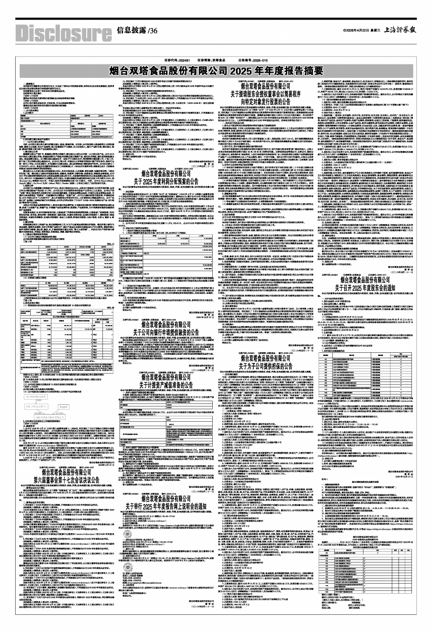 烟台双塔食品股份有限公司(以下简称“双塔食品”或“公司”)第六届董事会第十七次会议于2026年4月8日以电话的形式发出会议通知,并于2026年4月21日以现场及通讯的方式召开。会议应参加表决董事9人,实际参加表决董事9人。