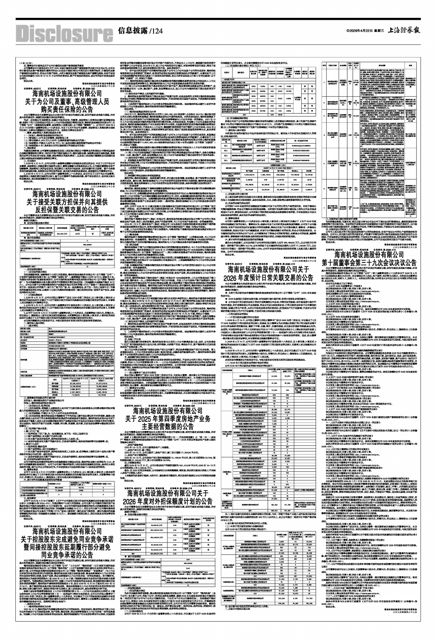 为进一步加强公司风险管理、保障公司股东利益,为董事、高级管理人员等依法履行职责提供保障,根据《中华人民共和国公司法》《上市公司治理准则》等相关规定,海南机场设施股份有限公司(以下简称“公司”)拟继续投保董事、高级管理人员责任险(以下简称“董责险”)。公司已于2026年4月21日召开第十届董事会第三十九次会议,审议了《关于为公司及董事、高级管理人员购买责任保险的议案》,本事项尚需提交公司股东会审议。现将有关事项公告如下: