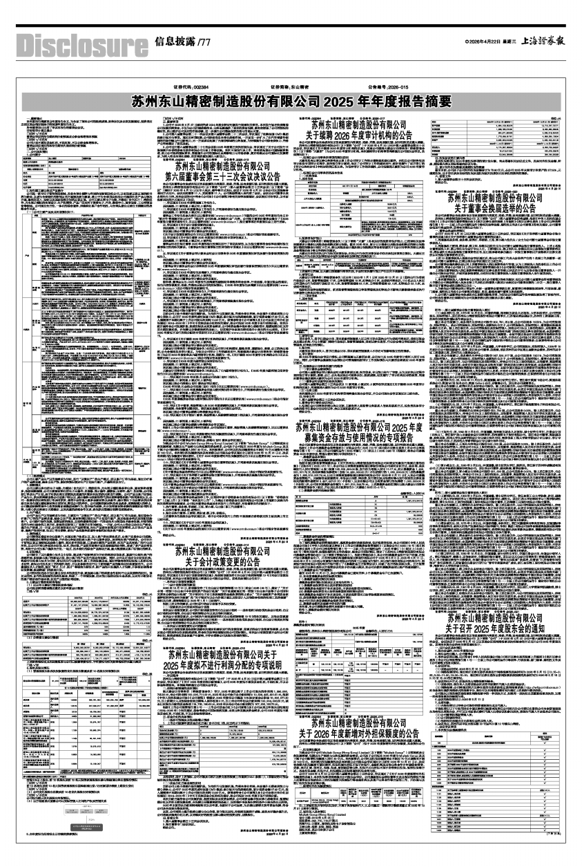苏州东山精密制造股份有限公司(以下简称“公司”)第六届董事会第三十三次会议(以下简称“会议”)通知于2026年4月10日以专人送达、邮件等方式发出,会议于2026年4月20日在公司以现场结合通讯方式召开。会议应到董事11人,实到董事11人。公司高级管理人员列席了会议。会议由公司董事长袁永刚先生主持。本次会议的召开符合《公司法》《公司章程》等有关法律法规规定,会议经过讨论审议,以书面投票表决的方式通过以下决议:
