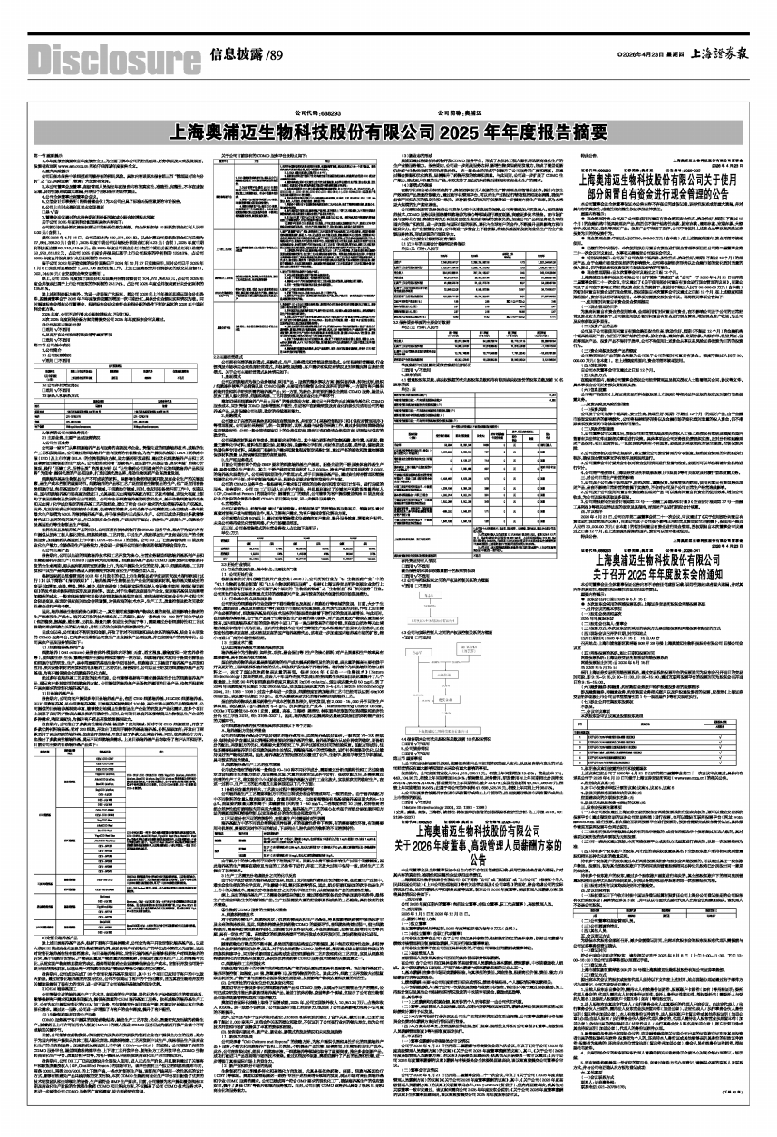 上海奥浦迈生物科技股份有限公司2025年年度报告摘要