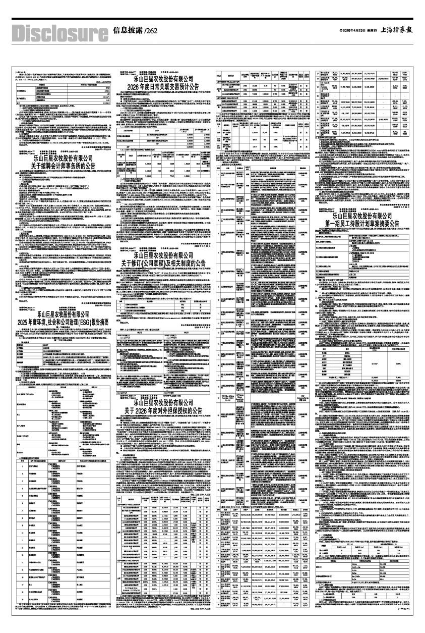 1、本摘要来自于《乐山巨星农牧股份有限公司2025年度环境、社会和公司治理(ESG)报告》全文,为全面了解本公司环境、社会和公司治理议题的相关影响、风险和机遇,以及公司可持续发展战略等相关事项,投资者应当到www.sse.com.cn网站仔细阅读《乐山巨星农牧股份有限公司2025年度环境、社会和公司治理(ESG)报告》全文。