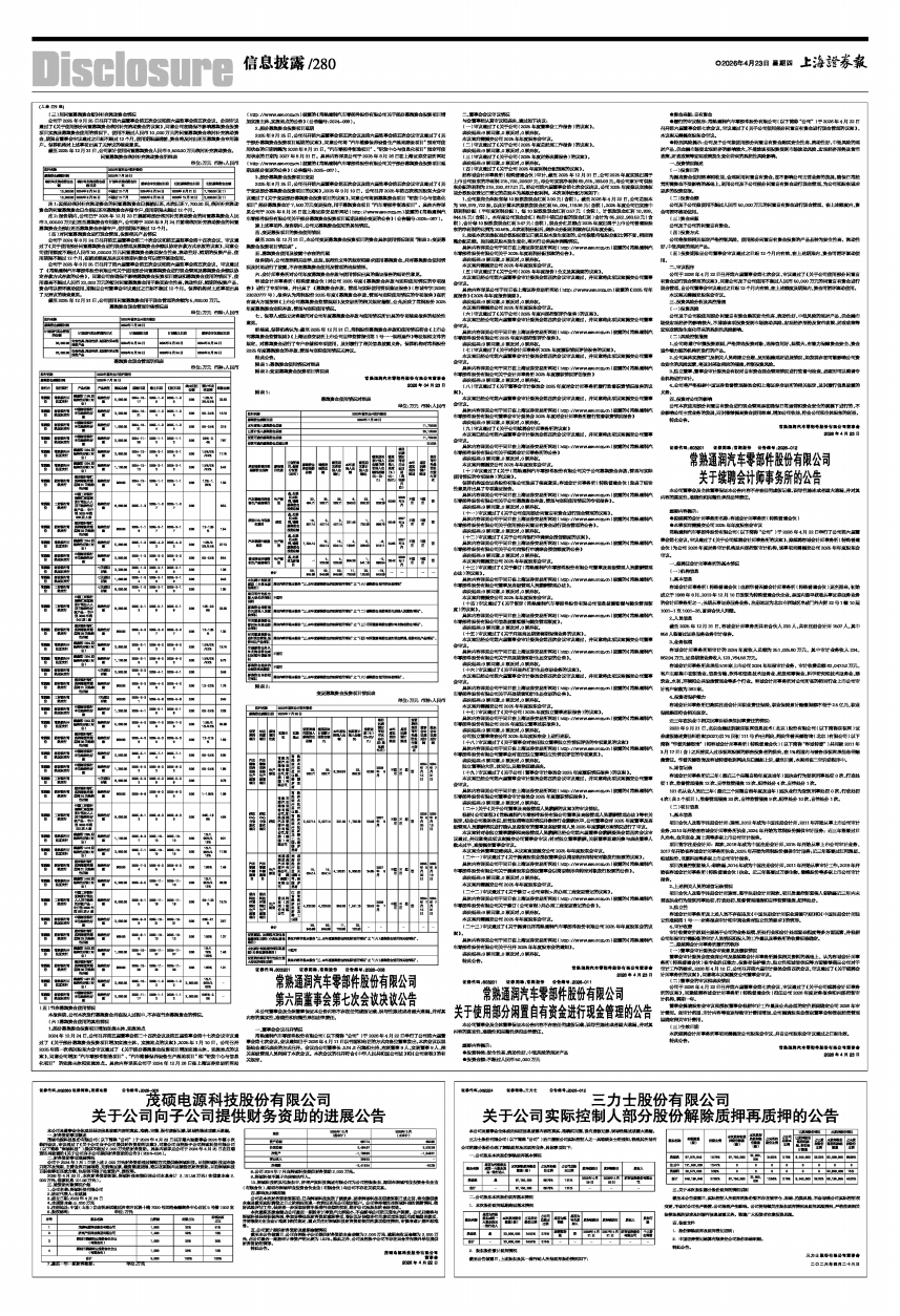 常熟通润汽车零部件股份有限公司(以下简称“公司”)于2026年4月22日举行了公司第六届董事会第七次会议。会议通知已于2026年4月11日以书面和电话的方式向各位董事发出。本次会议以现场结合通讯表决的方式召开。会议由公司董事长JUN JI召集和主持,应到董事9人,实到董事9人,相关高级管理人员列席了本次会议。本次会议的召开符合《中华人民共和国公司法》和《公司章程》的有关规定。