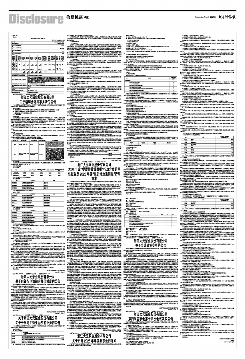具体内容详见上海证券交易所网站(www.sse.com.cn)及《上海证券报》《中国证券报》《证券时报》刊登的《浙江大元泵业股份有限公司关于续聘会计师事务所的公告》(公告编号:2026-012)。