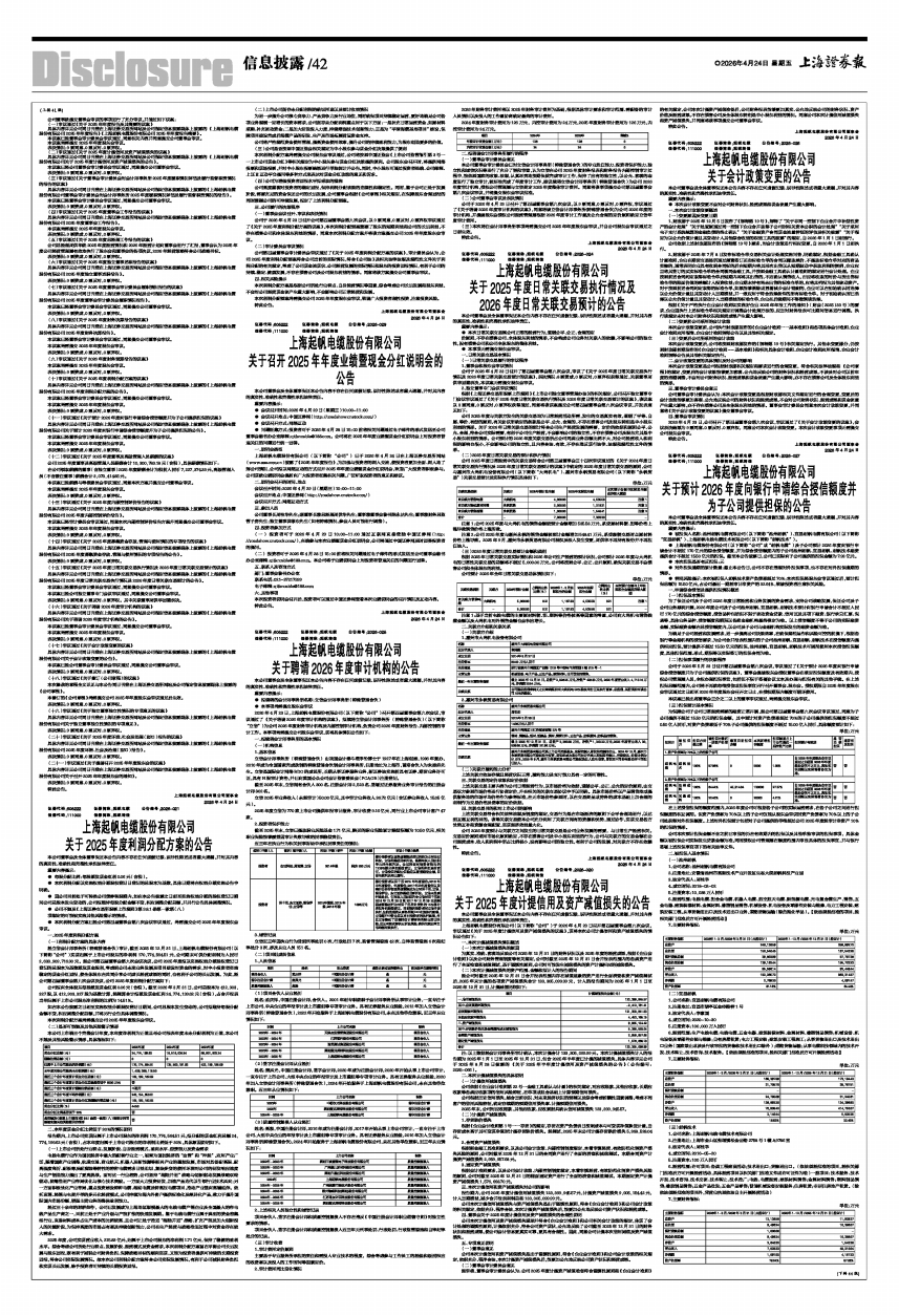 具体内容详见公司同日刊登在上海证券交易所网站及公司指定信息披露媒体上披露的《上海起帆电缆股份有限公司2025年年度报告》《上海起帆电缆股份有限公司2025年年度报告摘要》。