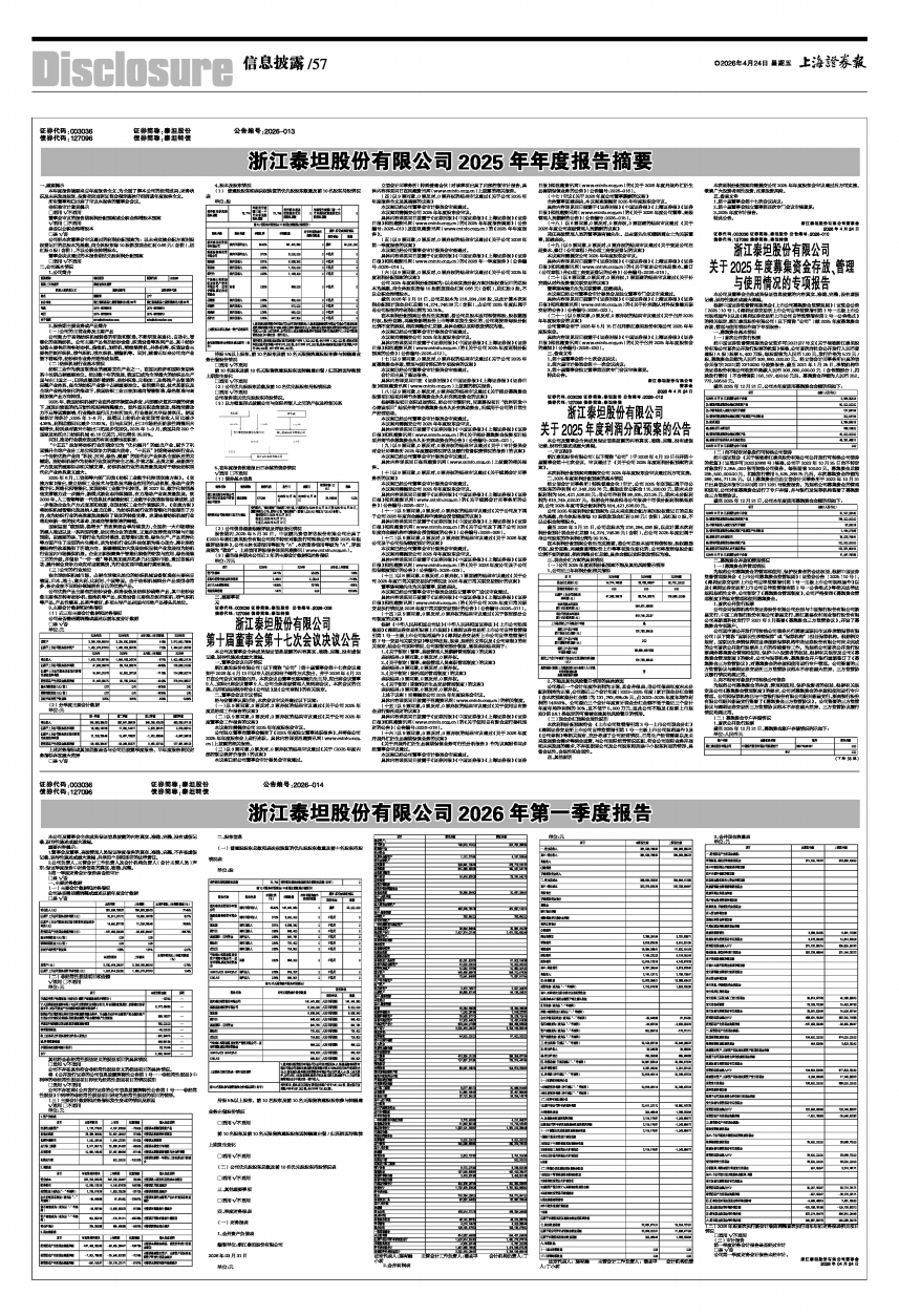 浙江泰坦股份有限公司(以下简称“公司”)于2026年4月23日召开第十届董事会第十七次会议,审议通过了《关于公司2025年度利润分配预案的议案》。