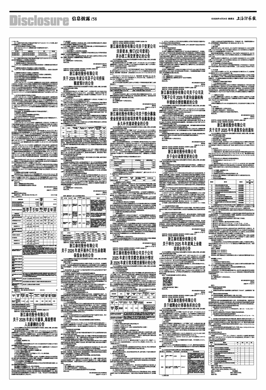 浙江泰坦股份有限公司(以下简称“公司”)本次预计的2026年度公司及子公司担保额度为人民币69,000.00万元,占公司最近一期经审计净资产的46.62%,本次担保额度预计中的被担保人包含资产负债率超过70%的子(孙)公司,敬请广大投资者注意投资风险。