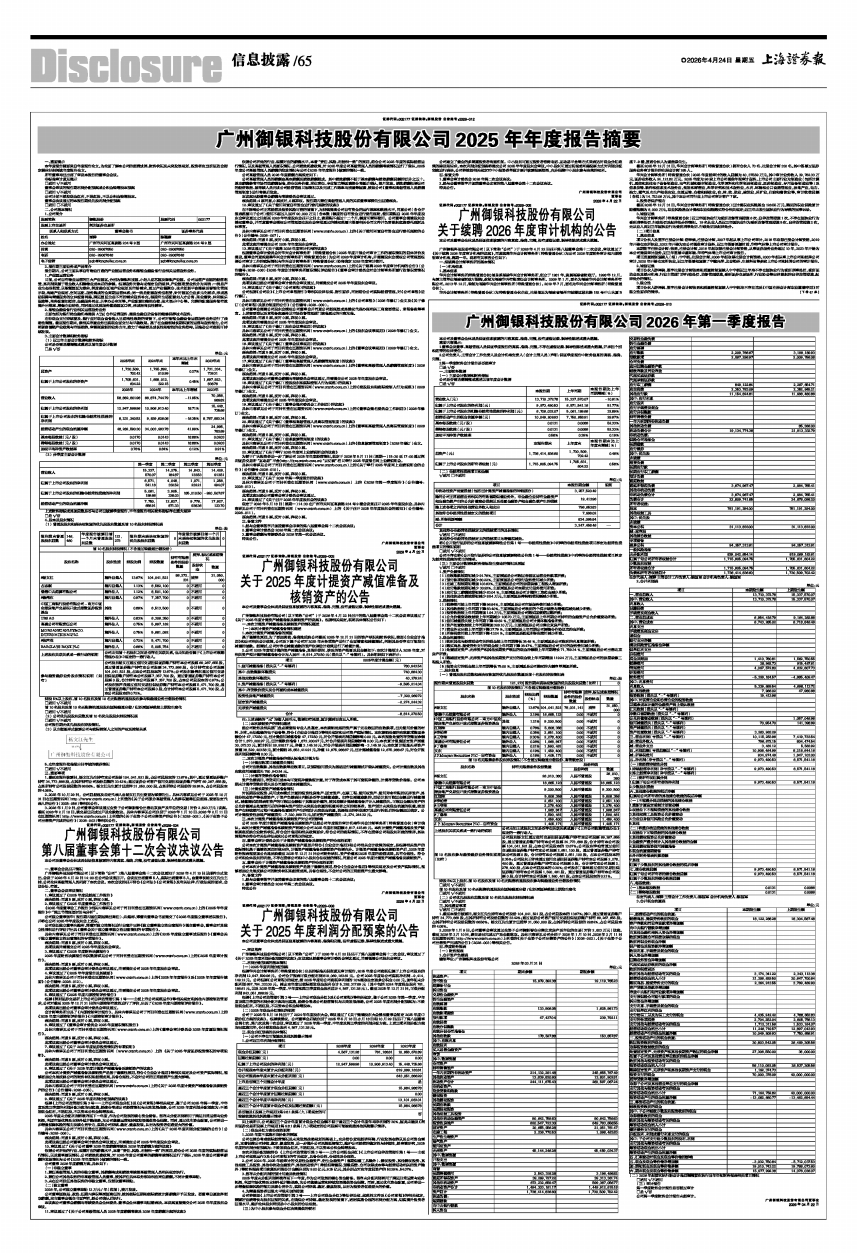 广州御银科技股份有限公司(以下简称“公司”)第八届董事会第十二次会议通知于2026年4月10日以邮件方式发出,会议于2026年4月22日14:00在公司会议室召开。会议应出席董事5人,实际出席董事5人,由董事长杨文江先生主持,公司全体高级管理人员列席了本次会议。本次会议的召开符合《公司法》《公司章程》及有关法律、行政法规的要求,会议合法、有效。