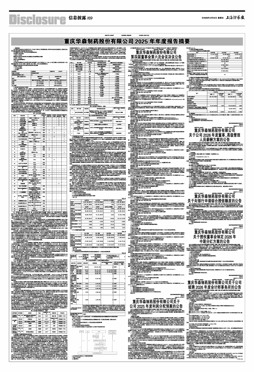 重庆华森制药股份有限公司(以下简称“公司”)于2026年4月23日召开第四届董事会第六次会议、第四届董事会审计委员会第五次会议,审议通过《关于公司〈2025年度利润分配预案〉的议案》,该议案尚需提交公司2025年年度股东会审议,现将相关情况公告如下: