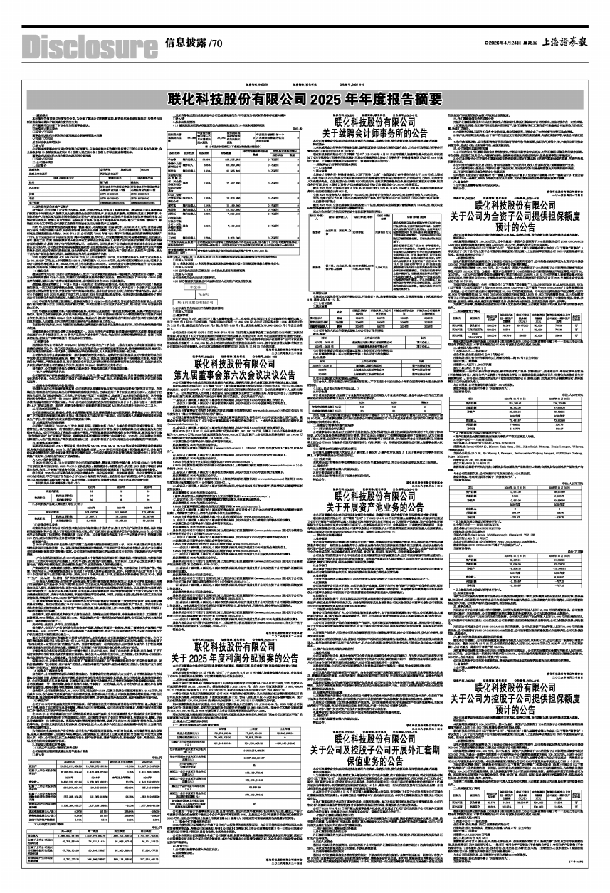 联化科技股份有限公司(以下简称“公司”)第九届董事会第六次会议通知于2026年4月10日以电子邮件方式发出。会议于2026年4月22日在联化科技会议室以现场表决的方式召开。会议应出席董事7人,实际出席董事7人。公司高级管理人员列席了本次会议,会议由董事长王萍女士召集和主持,符合《公司法》、《证券法》等法律法规、部门规章、规范性文件及《公司章程》的有关规定。会议形成如下决议: