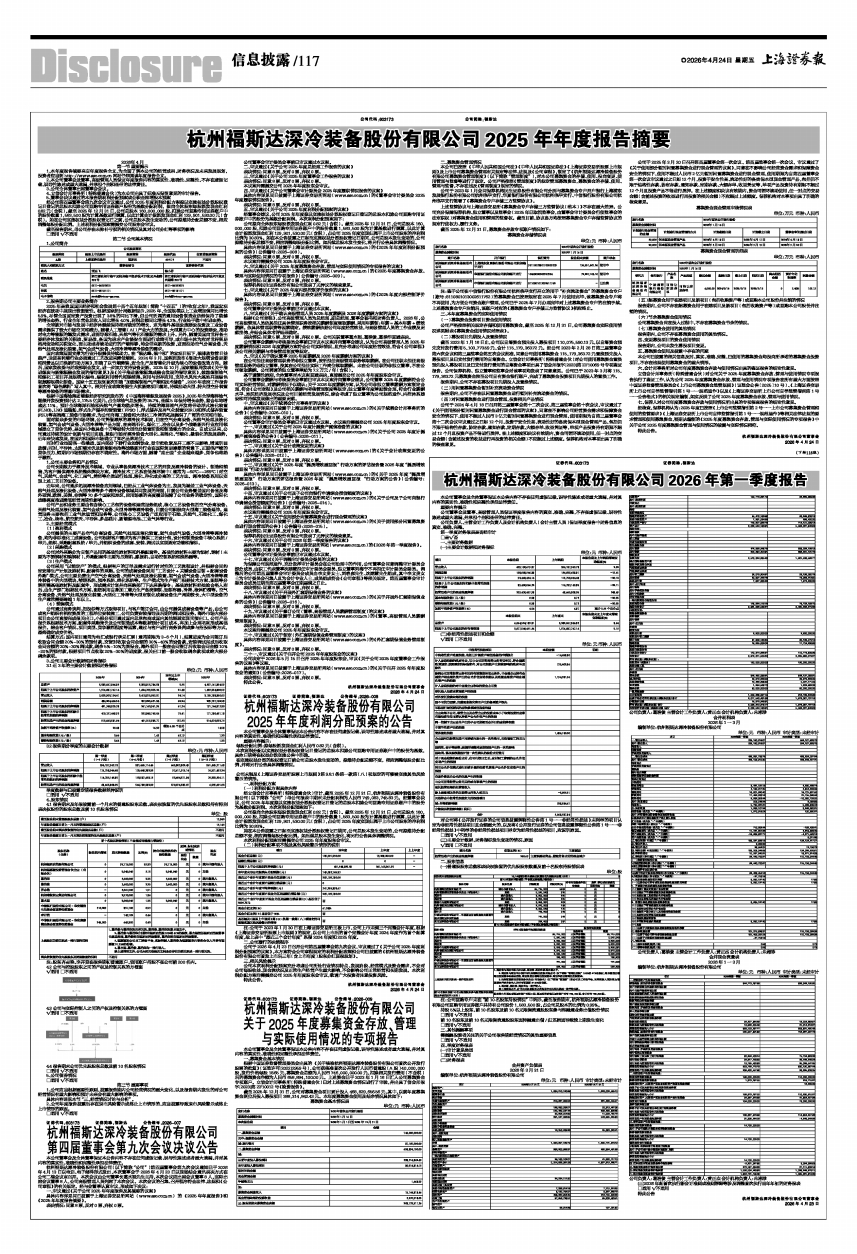 杭州福斯达深冷装备股份有限公司(以下简称“公司”)第四届董事会第九次会议通知已于2026年4月13日以电话、电子邮件形式发出,本次董事会于2026年4月23日以现场结合通讯表决方式在公司二楼会议室召开。本次会议由公司董事长葛水福先生主持,本次会议应出席会议董事8人,实际出席会议董事8人,公司高级管理人员列席了本次会议。本次会议的召集、召开程序符合法律、法规和《公司章程》的有关规定。经与会董事认真审议,形成如下决议: