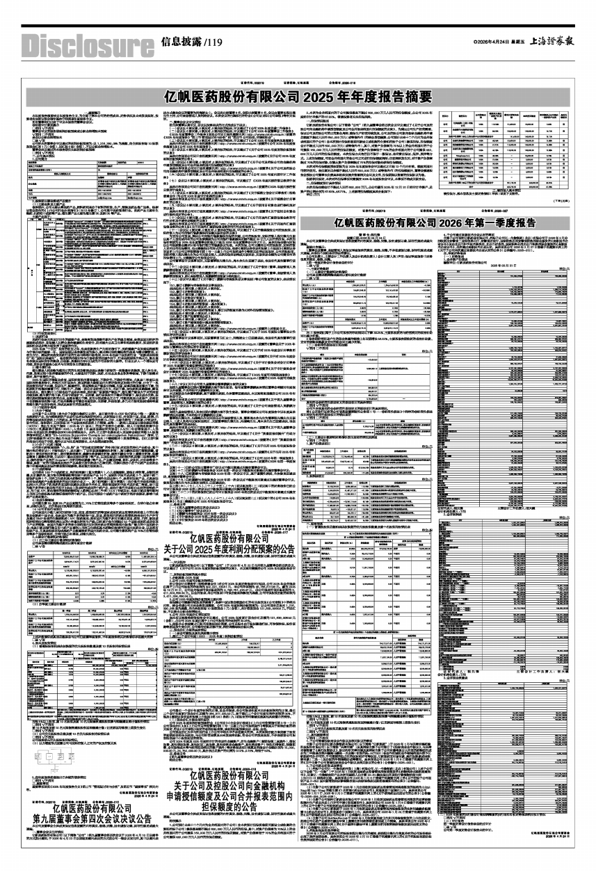 亿帆医药股份有限公司(以下简称“公司”)于2026年4月22日召开第九届董事会第四次会议,审议通过了《关于公司2025年度利润分配预案的议案》,本议案尚需提交公司2025年年度股东会审议。