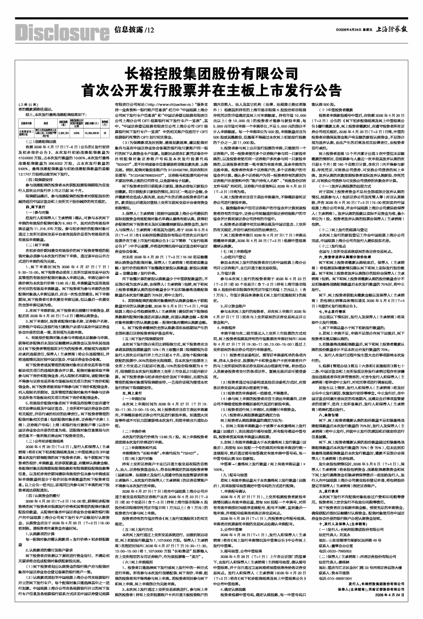 3、保荐人(主承销商)按照中国结算上海分公司提供的实际划拨资金有效配售对象名单确认最终有效认购。获得初步配售的网下投资者未及时足额缴纳新股认购资金的,发行人与保荐人(主承销商)将视其为违约,将于2026年5月6日(T+4日)在《长裕控股集团股份有限公司首次公开发行股票并在主板上市发行结果公告》(以下简称“《发行结果公告》”)中予以披露,并将违约情况报中国证监会和中国证券业协会备案。