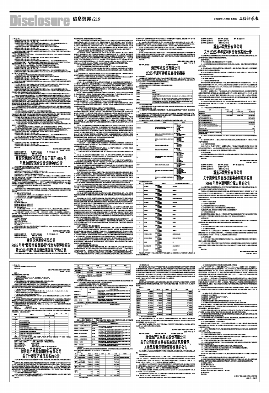 为深入贯彻中央金融工作会议精神,落实国务院《关于进一步提高上市公司质量的意见》要求,积极响应上海证券交易所《关于开展沪市公司“提质增效重回报”专项行动的倡议》,践行“以投资者为本”的理念,推动瀚蓝环境股份有限公司(以下简称“公司”)高质量发展和投资价值提升,保护投资者尤其是中小投资者合法权益,公司于2026年4月22日召开第十一届董事会第三十六次会议,审议通过了《关于2025年度“提质增效重回报”行动方案评估报告暨2026年度“提质增效重回报”行动方案的议案》,对 2025 年度行动方案实施情况进行评估,并明确 2026 年度行动方案。具体情况如下: