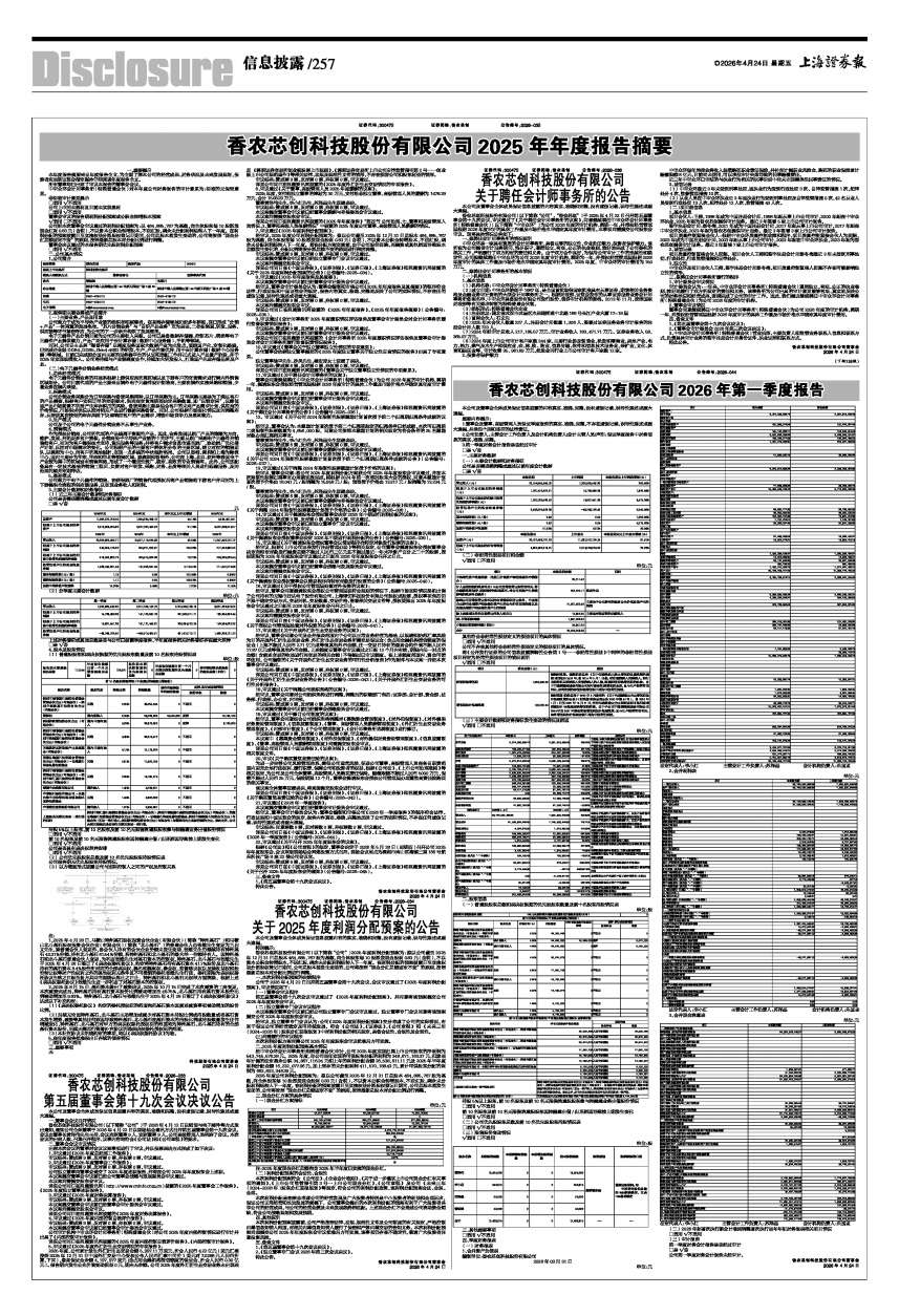 香农芯创科技股份有限公司(以下简称“公司”)于2026年4月12日以短信与电子邮件等方式发出通知,通知公司全体董事于2026年4月22日以现场结合通讯方式召开第五届董事会第十九次会议。会议由董事长黄泽伟先生主持,会议应到董事9人,实到董事9人。公司高级管理人员列席了会议。本次会议的出席人数、召集召开程序、议事内容均符合《公司法》和《公司章程》的要求。