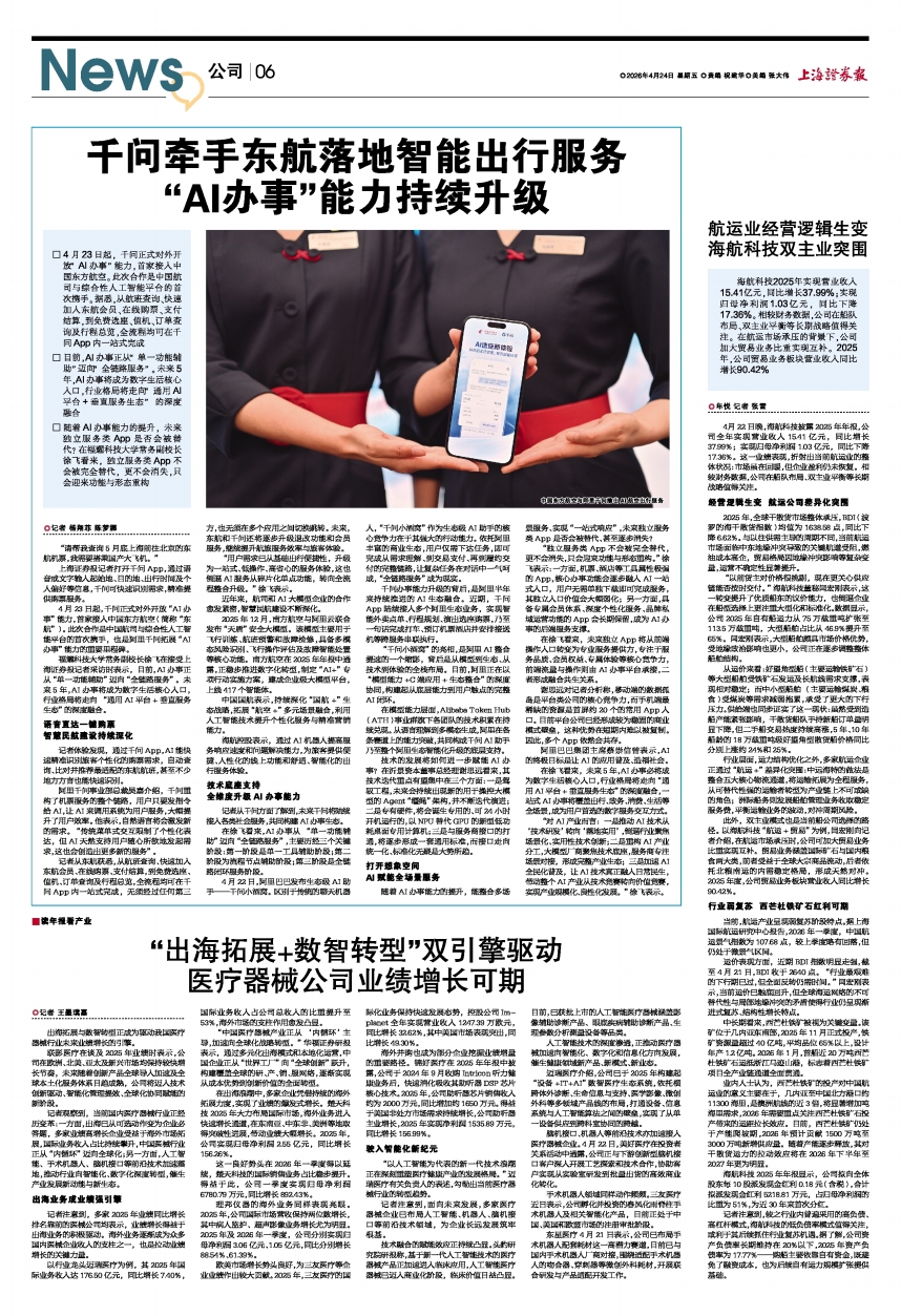 □ 4月23日起,千问正式对外开放“AI办事”能力,首家接入中国东方航空。此次合作是中国航司与综合性人工智能平台的首次携手。据悉,从航班查询、快速加入东航会员、在线购票、支付结算,到免费选座、值机、订单查询及行程总览,全流程均可在千问App内一站式完成
