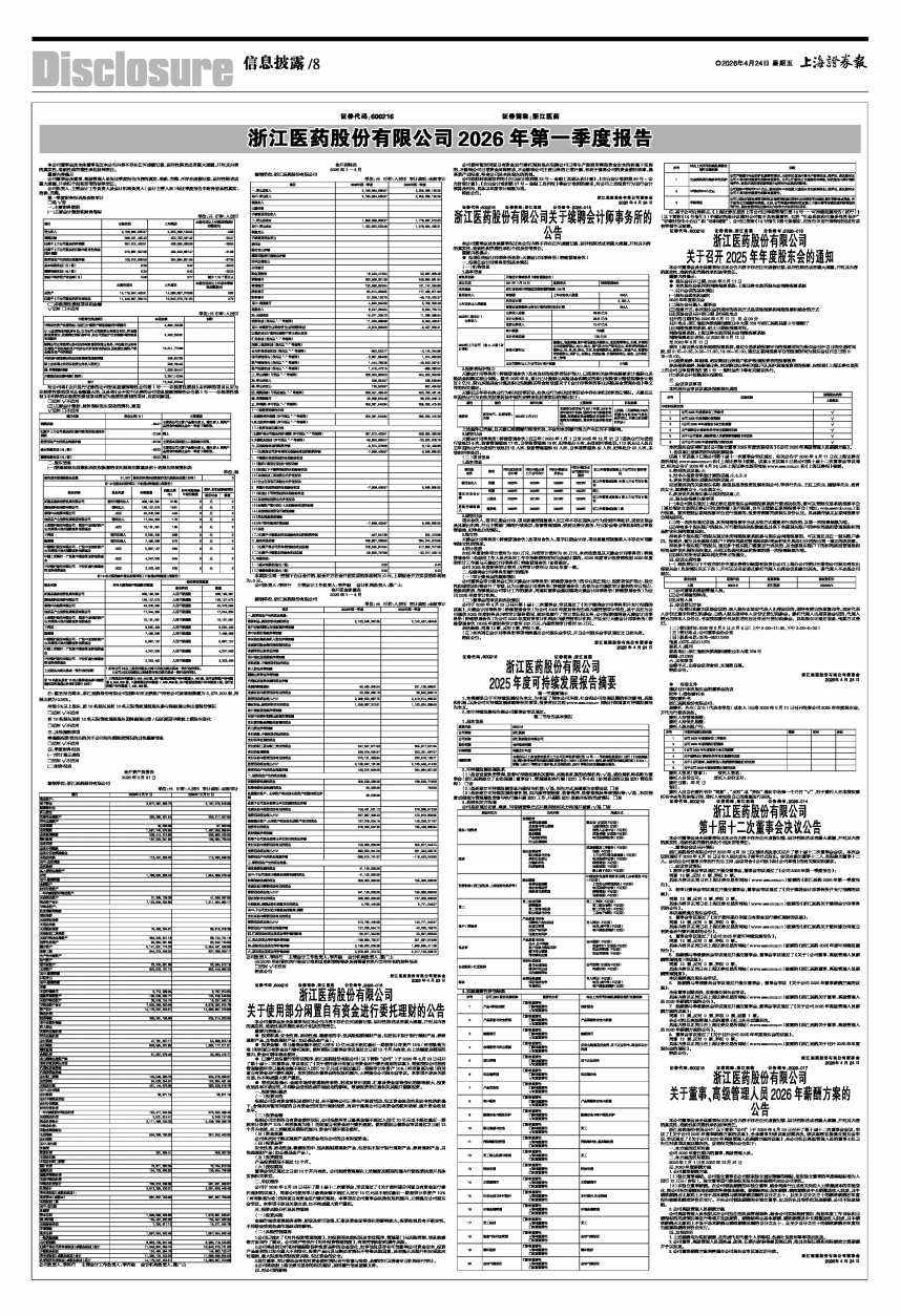 具体内容详见同日在上海证券交易所网站(www.sse.com.cn)披露的《浙江医药2026年第一季度报告》。