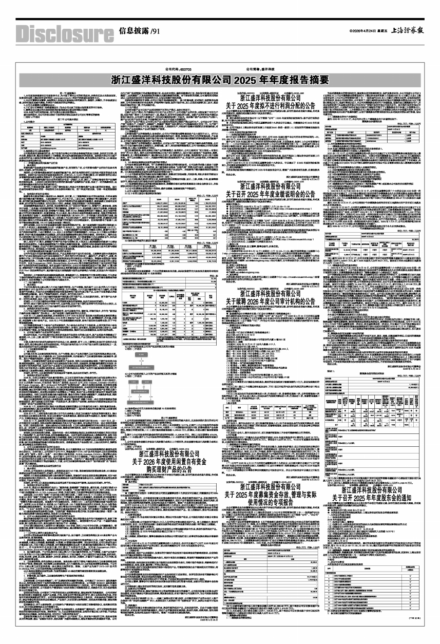 中汇会计师事务所(特殊普通合伙)认为,盛洋科技公司管理层编制的《关于2025年度募集资金存放、管理与实际使用情况的专项报告》在所有重大方面符合《上海证券交易所上市公司自律监管指引第1号一一规范运作(2025年5月修订)》及相关格式指引的规定,公允反映了盛洋科技公司2025年度募集资金实际存放、管理与实际使用情况。