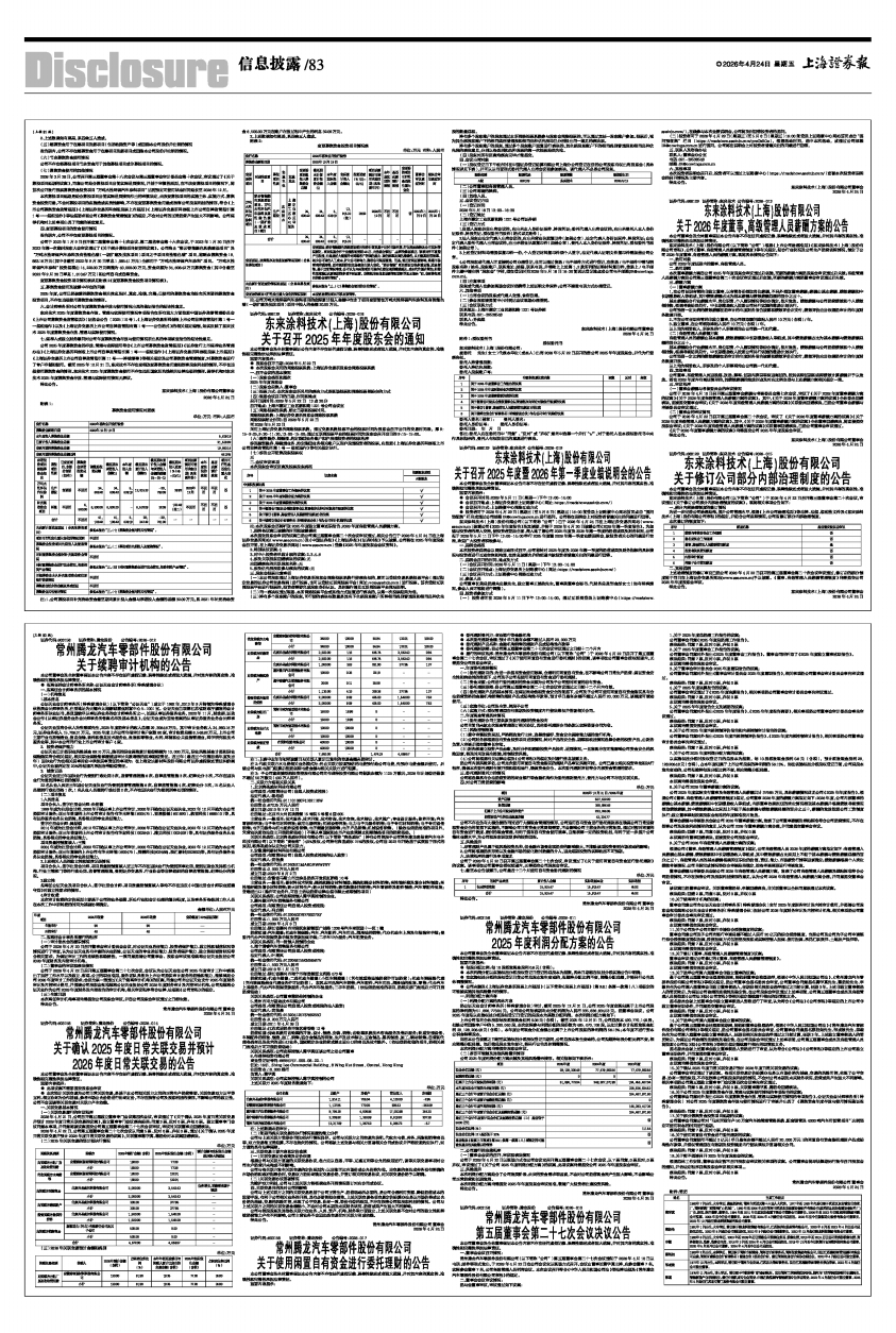 东来涂料技术(上海)股份有限公司(以下简称“公司”)于2026年4月22日召开第三届董事会第二十次会议,审议通过《关于修订公司部分内部治理制度的议案》。现将相关事项公告如下: