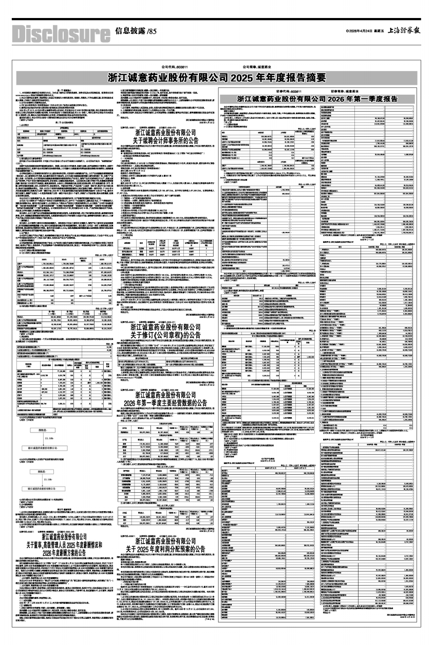 根据上海证券交易所发布的《上市公司行业信息披露指引第六号一一医药制造》的要求,现将浙江诚意药业股份有限公司(以下简称“公司”)2026年第一季度主要经营数据披露如下: