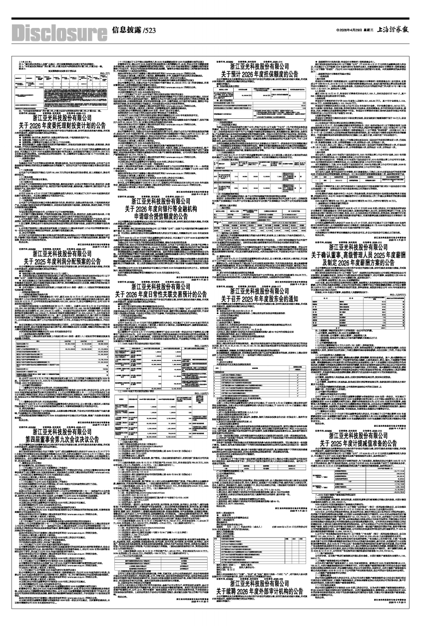 浙江亚光科技股份有限公司(以下简称“公司”)于2026年4月27日召开了第四届董事会第九次会议,审议通过了《关于2026年度委托理财投资计划的议案》,决定拟使用不超过人民币30,000万元自有资金进行现金管理。本次授权决议的有效期为一年,自董事会审议通过之日起12个月内有效,在上述期限内,资金可循环使用。