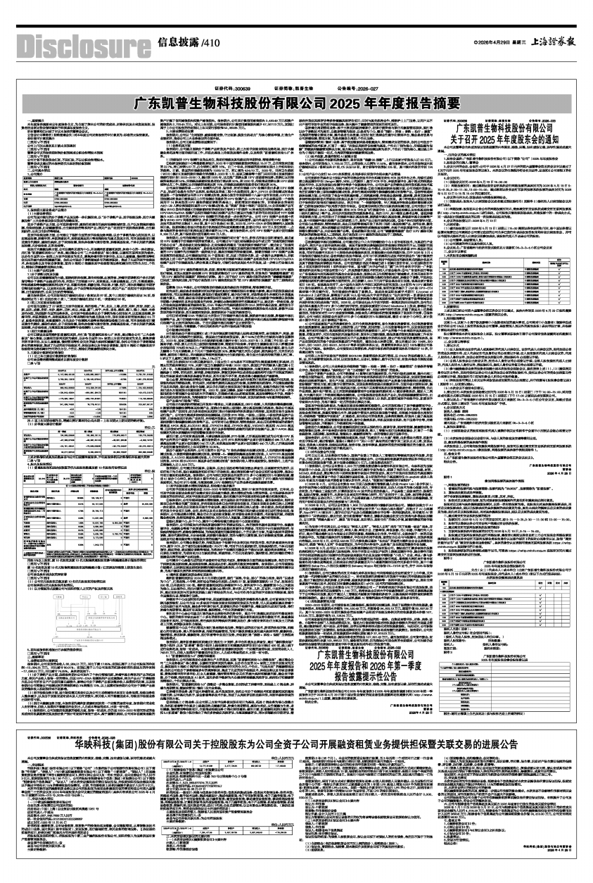 广东凯普生物科技股份有限公司《2025年年度报告》《2025年年度报告摘要》和《2026年第一季度报告》已于2026年4月29日在中国证监会指定的创业板信息披露网站巨潮资讯网(http://www.cninfo.com.cn/)上披露,请投资者注意查阅。