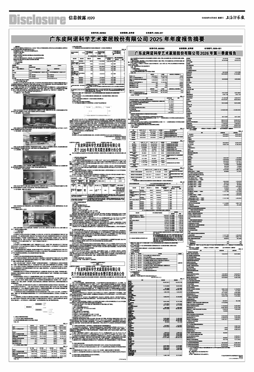 广东皮阿诺科学艺术家居股份有限公司2026年第一季度报告