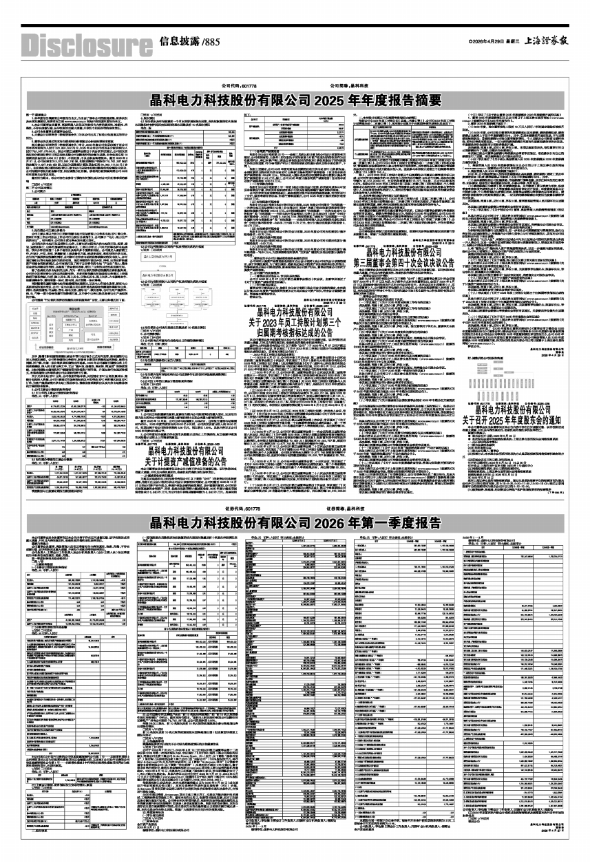 晶科电力科技股份有限公司(以下简称“公司”)于2026年4月27日召开第三届董事会第四十次会议,审议通过了《关于2023年员工持股计划第三个归属期考核指标达成的议案》。现将有关情况公告如下: