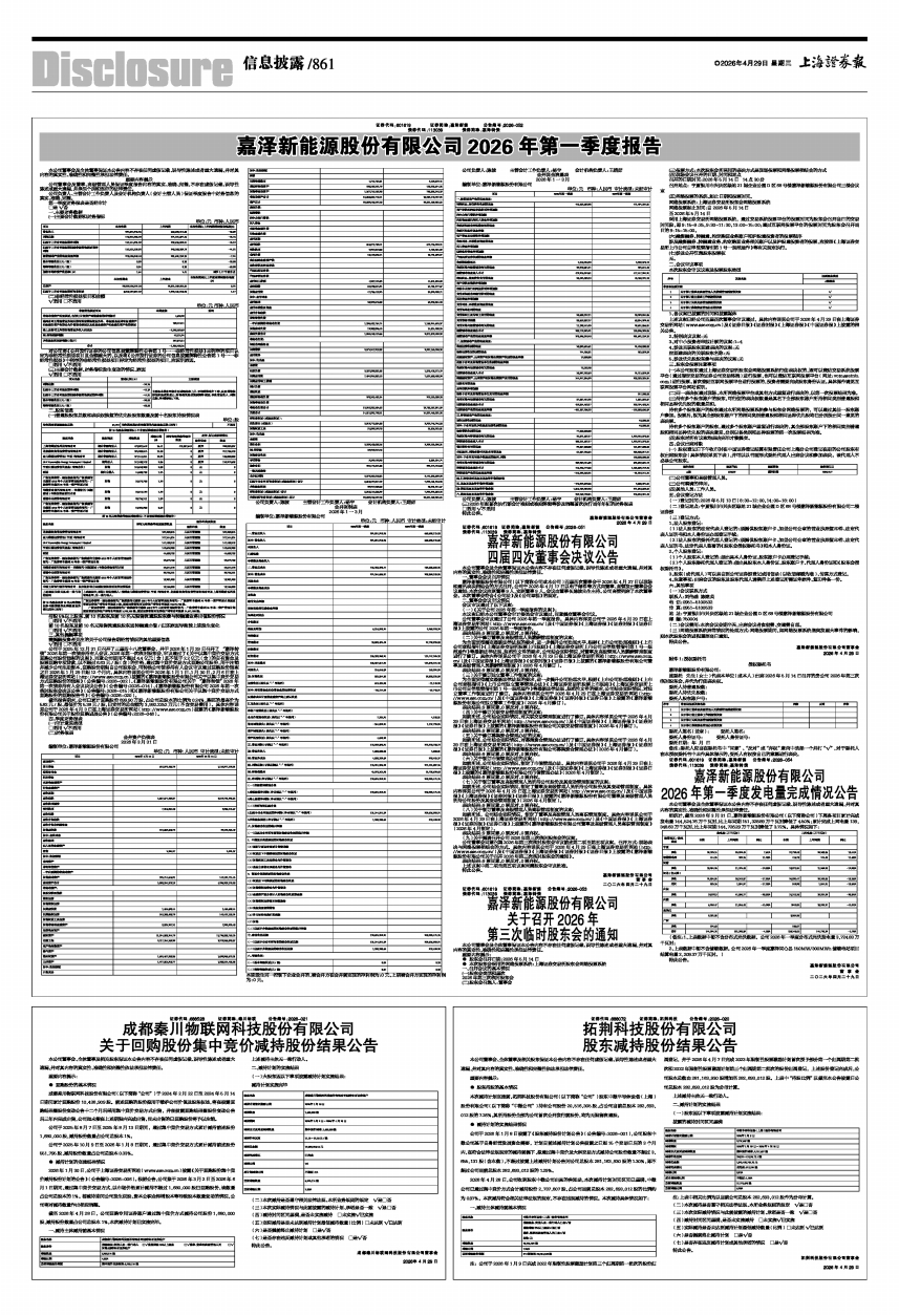 截至报告期末,公司已累计回购股份699.90万股,占公司总股本的比例为0.24%,购买的最高价为5.82元/股、最低价为5.38元/股,已支付的总金额为3,992.2252万元(不含交易费用)。具体内容详见公司于2026年4月3日在上海证券交易所网站(http://www.sse.com.cn)披露的《嘉泽新能源股份有限公司关于股份回购进展公告》(公告编号:2026-046)。